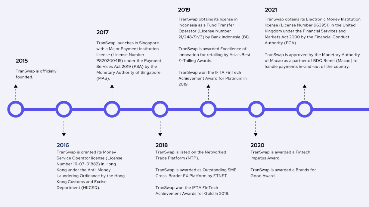 Transwap is licensed and regulated in Singapore, the United Kingdom, Hong Kong, Indonesia, and Macau. All funds are securely held with major global financial institutions. With functionality and transparency at the core of our operations, Transwap is an award-winning fintech solution provider that is customisable to your business needs.